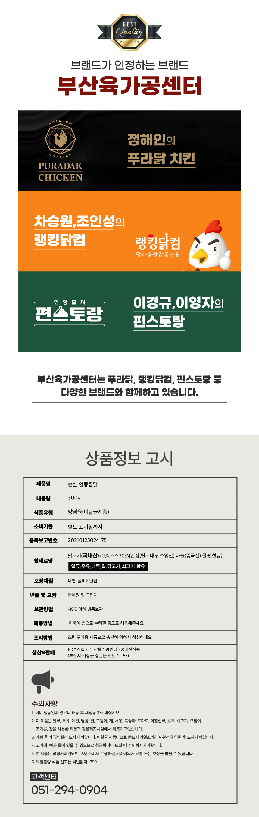 | 축산물 표시사항 | 알러지 유발물질 : 알류,우유,대두,밀,닭고기,쇠고기 함유 |